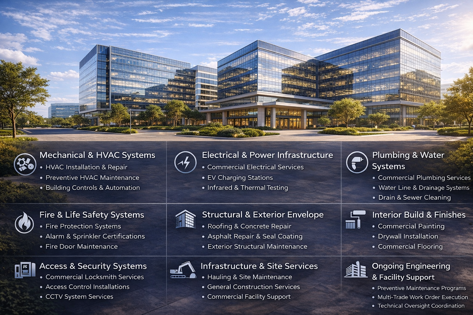 From critical mechanical and electrical systems to structural integrity, life safety compliance, and site infrastructure, our team delivers integrated solutions tailored to the demands of commercial environments.